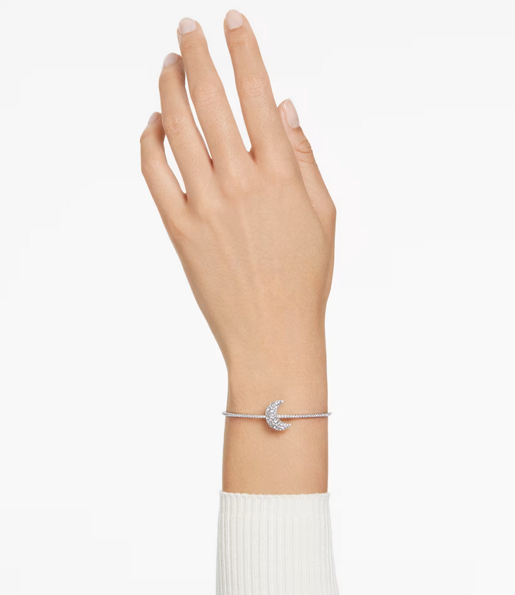 Reflete the nights' magic to your wrist. This rhodium coated ring bracelet features a crystallized design with a crescent motif in the middle, revealing five different crystal sizes to create a refined pavilion effect. The design has a lobster closure mechanism and a perfect choice that will highlight the moon's glow.